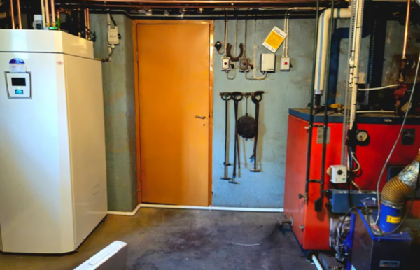 一個典型的混合住宅供暖和制冷系統,包括一個新的空氣-水熱泵(左)和一個現有的改造顆粒燃燒器,右側是一個舊的油鍋爐。